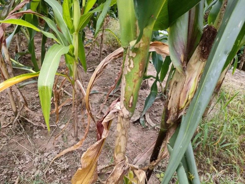 干燥条件下扩展缓慢,但病部遇风也易折断,不能抽穗或结实。叶片呈现“青枯状”萎蔫,并且玉米会因为茎秆开裂而导致大量发病植株倒折和倒伏,发病处有“菌脓溢出”且有“腥臭味”。