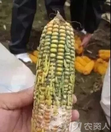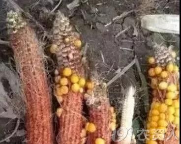 原因:籽粒被害虫咬食,通常发生在果穗的某一部分,虫子通过苞叶从顶部进入果穗,部分受损的籽粒后期会被霉菌侵染。雨水聚集在果穗底部,导致穗腐病或穗萌。