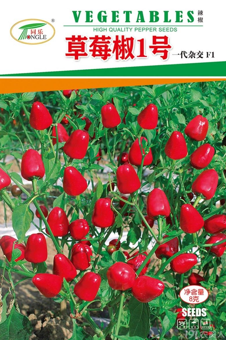 新育成的中熟单生草莓形朝天椒品种,株形直立,生长势强,株高90厘米左右,枝条硬,节间密,连续挂果力强,前后果实一致性好。果实锥形,果尖钝圆,具有较高的食用和观赏价值。果长3厘米左右,果粗约3厘米,单果重10克左右,红果深红艳亮,辣味香浓,干物质含量25%左右。油分多,叶片小,抗病强,单株挂果多,丰产潜力大,耐湿热,抗逆性好,适合制干或泡椒。百度“草莓椒1号”即可了解该品种更多特性。