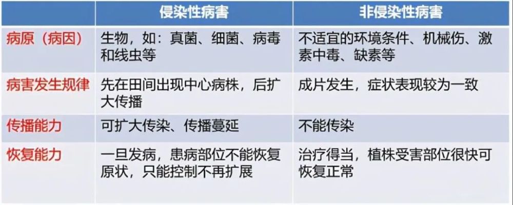 农作物病害分为侵染性病害和非侵染性病害,费侵染性病害一般是不适宜的物理、化学等非生物环境因素直接或间接引起的植物病害,又称生理性病害。因不能传染,也称非传染性病害。如土壤、营养、水分、温度、光照、和有毒物质等,阻碍植株的正常生长而出现不同病症,植物对不利环境条件有一定适应能力,但不利环境条件持续时间过久或超过植物的适应范围时就会对植物的生理活动造成严重干扰和破坏,导致病害,甚至死亡。如作物缺素、冻害、洪涝、干旱、药害、肥害、土壤酸化等造成的作物长势不良。生理性病害一是可以通过选育抗性品种,培育壮苗,来提高作物的抗逆性。二是通过植物生长调节剂和生物刺激素调理作物生长发育,增强抗逆能力。三是改善作物生长环境,维持生态平衡和促进生态的良性循环。