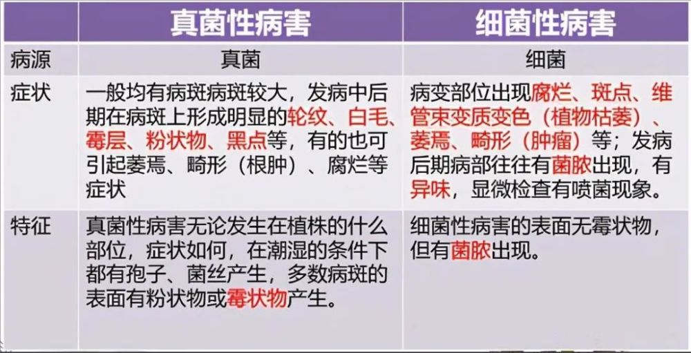 区分真菌性病害、细菌性病害和病毒病:首先是看病症类型,通常我们把病株症状变化分成五大类型,即:腐烂、坏死、变色、萎蔫、畸形。由于真菌的种类太多,不同真菌发病能带来以上五种病状,但其中最常见的是却是坏死和腐烂,例如炭疽病和褐斑病。细菌则通常破坏细胞壁,让细胞内的细胞质、细胞液外渗或阻塞水和营养物质在植物体内运输,所以主要会导致腐烂、萎蔫症状。病毒侵入植物后一般不会立即杀死植物,主要是影响植物生长发育过程,引起植株颜色或形状的改变,即变色和畸形。