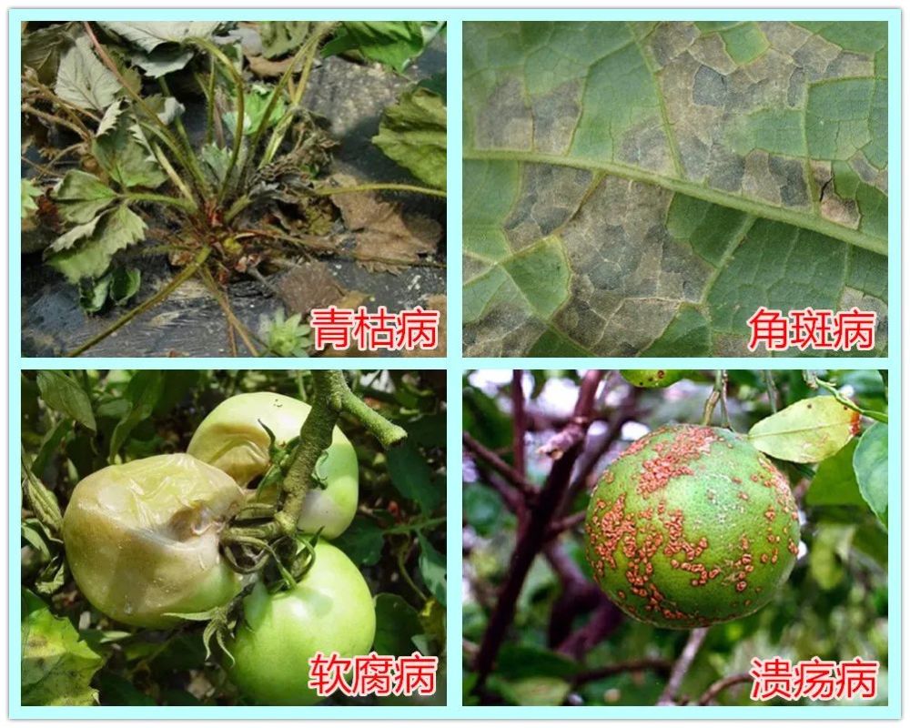 侵染植物的细菌都是杆状菌,大多具有一至树根鞭毛,可通过自然孔口(气孔、皮孔、水孔等)和伤口侵入,借流水、雨水、昆虫等传播,在病残体、种子、土壤中越冬,在高温、高湿条件下容易发病。细菌性病害症状多表现为萎蔫、腐烂、穿孔等,发病后期遇潮湿天气,在病部溢出细菌粘液,是细菌病害的典型特征。软腐病、黑腐病、环腐病、角斑病、疮痂病、溃疡病、菜豆疫病等。