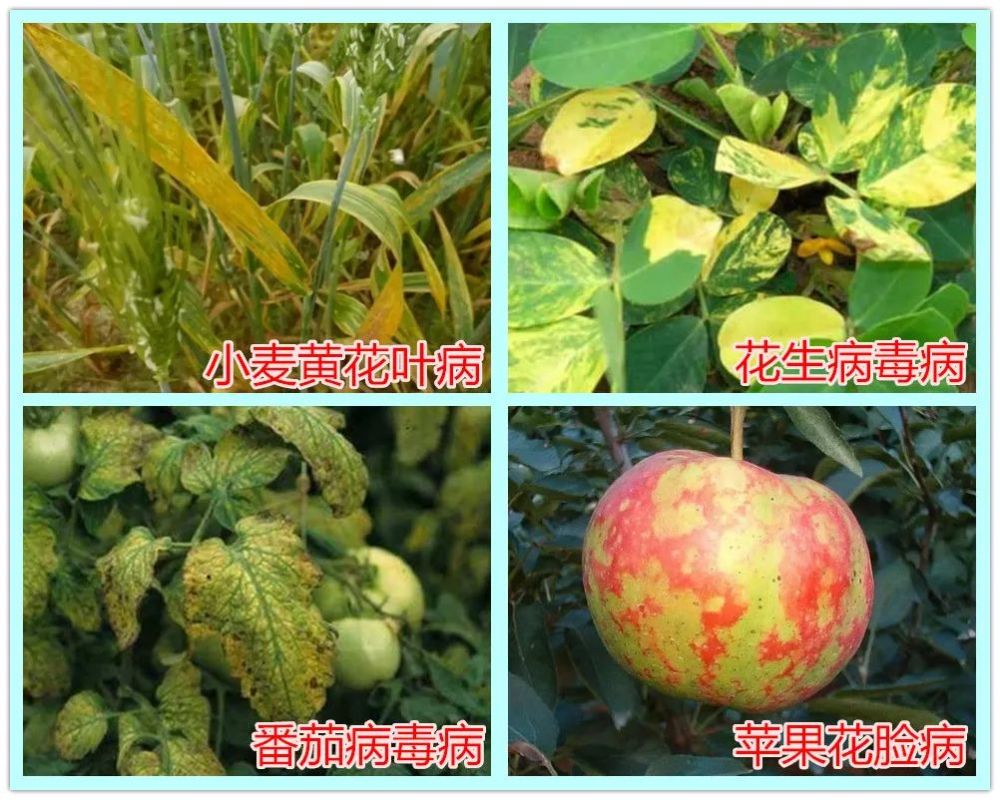 病毒主要借助带毒昆虫传染,有些病毒病可以通过线虫传染。病毒在杂草、块茎、种子和昆虫等,病毒可以活体组织内越冬。病毒病的发病症状则相对比较明显,叶片斑驳、花叶、皱缩、卷曲、畸形、簇生、矮化、坏死、斑点,斑驳处颜色对比十分鲜明。为害果实时的主要表现是,成熟期果实上有条斑,从果实的尖端向上变色,在变色的部位上,有短的褐色条纹,及向内凹陷。如烟草花叶病毒病、黄瓜花叶病毒病、小麦丛矮病毒病等。