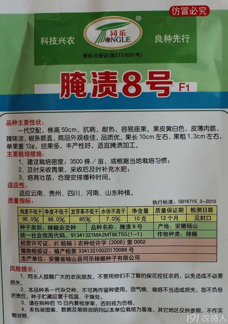 腌渍8号是高辣一代杂交良种,株高50厘米,抗病,耐热,坐果性好。成品果为黄白色,老熟后变为红色,皮薄肉脆,椒条顺直,辣味浓,外观美,品质优。果长10厘米左右,果径1.3厘米左右,单果重12克,结果多,丰产性好,适宜腌渍加工。如想了解该品种更多特性,请百度“腌渍8号”。