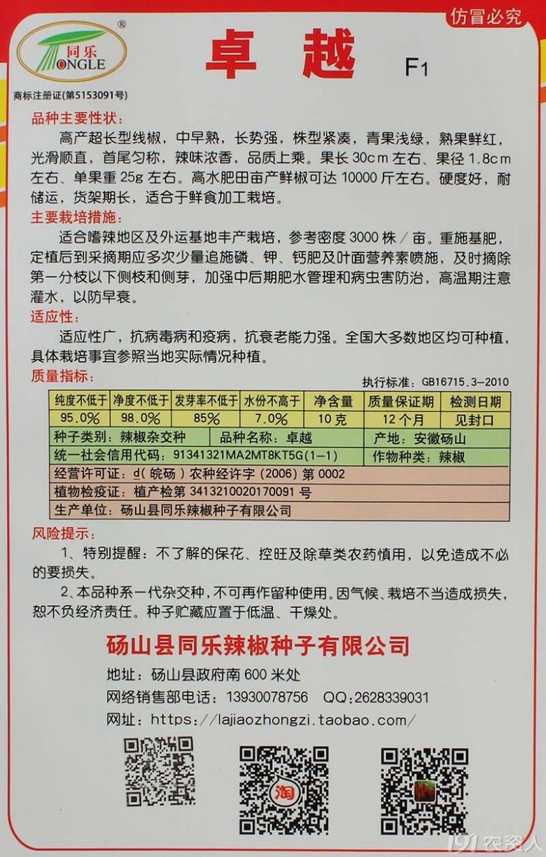 卓越线椒属中早熟、超高产、超长型线椒。长势强,株型紧凑,青果浅绿,熟果鲜红,光滑顺直,首尾匀称,辣味浓香,品质上乘。果长30厘米左右、果径1.8厘米左右、单果重25克左右。高水肥田亩产鲜椒可达10000斤左右。硬度好,耐储运,货架期长,适合于鲜食加工栽培。适应性广,抗病毒病和疫病,抗衰老能力强。如想了解该品种更多信息,请百度“卓越线椒”。