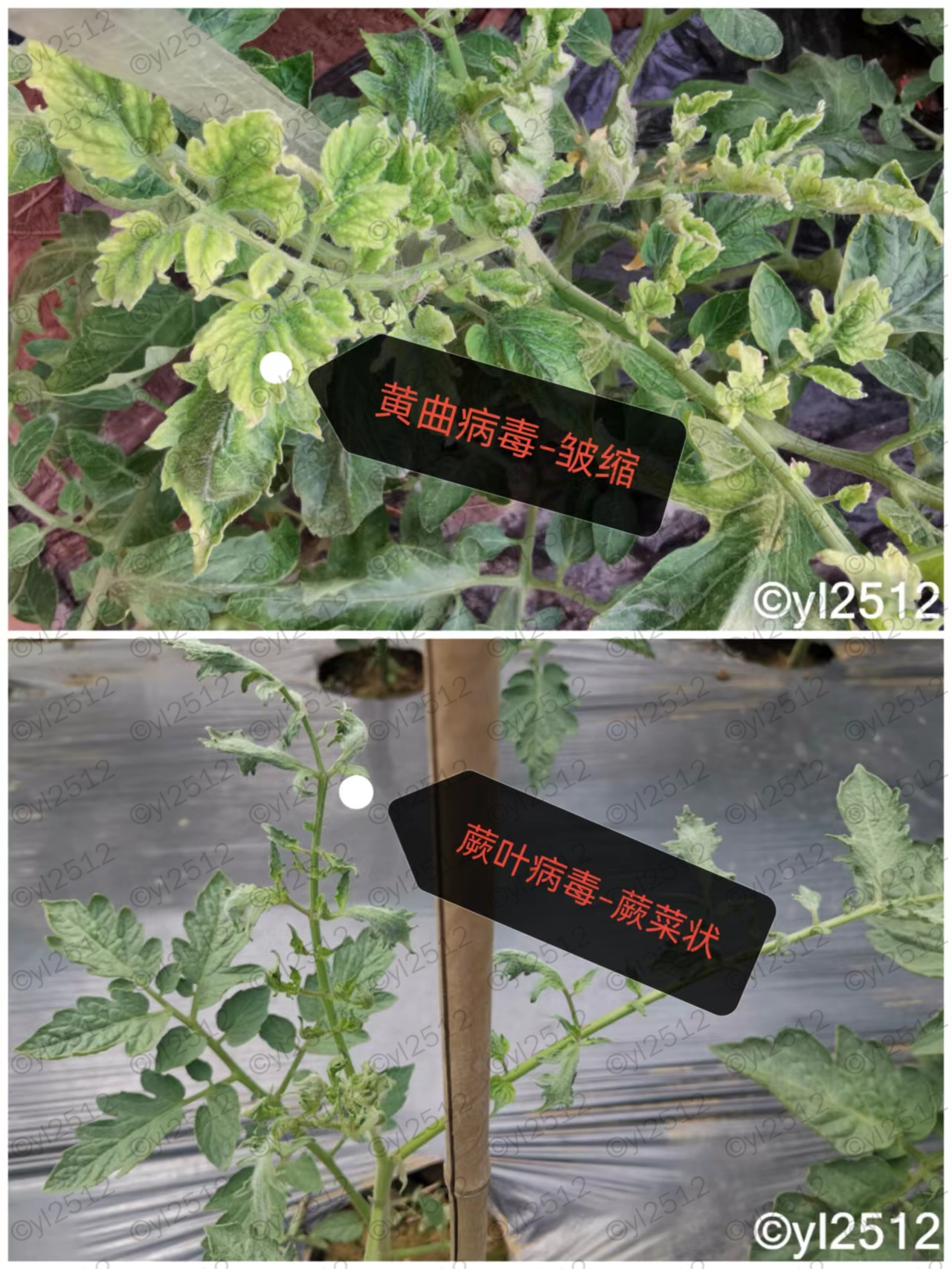 植株染病之后,普遍不会导致植株死亡,而是随着发病时间进程存在一个由轻到重的发病过程,因此我们可以在同一地块看到不同发病程度的病毒植株。