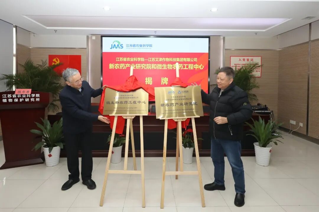 在与会领导、专家的共同见证下,省农科院副所长、副书记、新农药产业研究院院长樊磊和艾津集团常务副总裁石伟山代表院企双方签署了共建新农药产业研究院和微生物农药工程中心合作协议。江苏省农业科学院党委委员、副院长孙洪武和艾津集团董事长张申伟共同为“一院一中心”揭牌。
