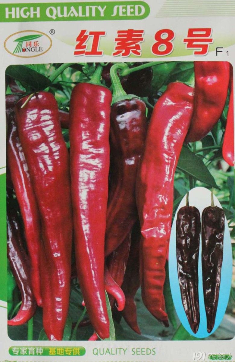 红素8号是早熟一代杂交种,果长18厘米,果径3厘米,青果绿色,红果里外呈紫红色,脱水快,色价高,无辣味,出粉率高,连续座果率高,抗病强,一般亩产干椒500-600公斤,高产克达700公斤以上,是加工出口及提取色素的优秀品种。百度“红素8号”了解该品种更多信息。