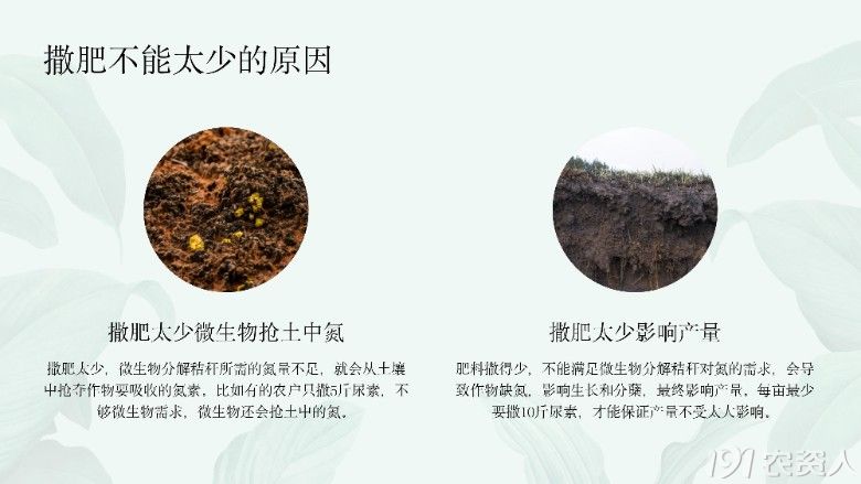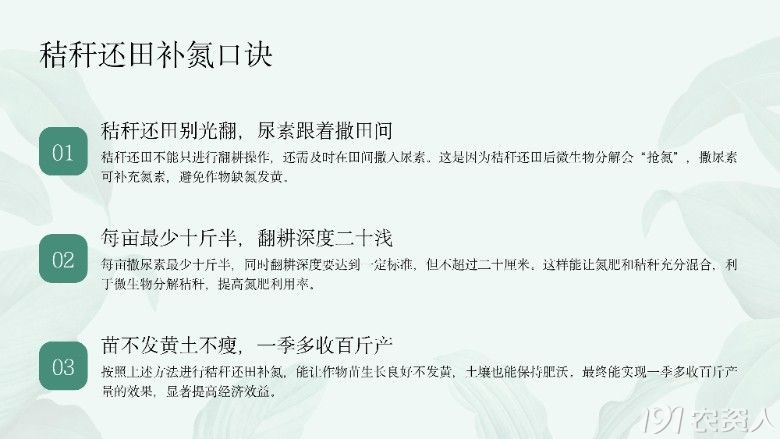最后记个小口诀,好记还管用:“秸秆还田别光翻,尿素跟着撒田间,每亩最少十斤半,翻耕深度二十浅,苗不发黄土不瘦,一季多收百斤产。”