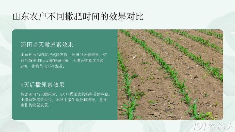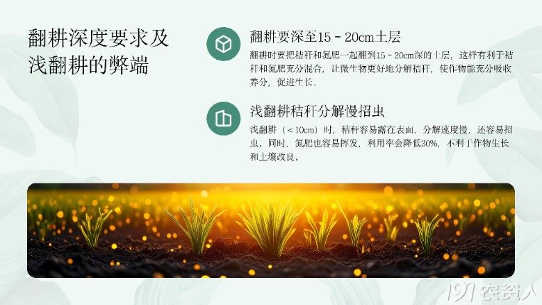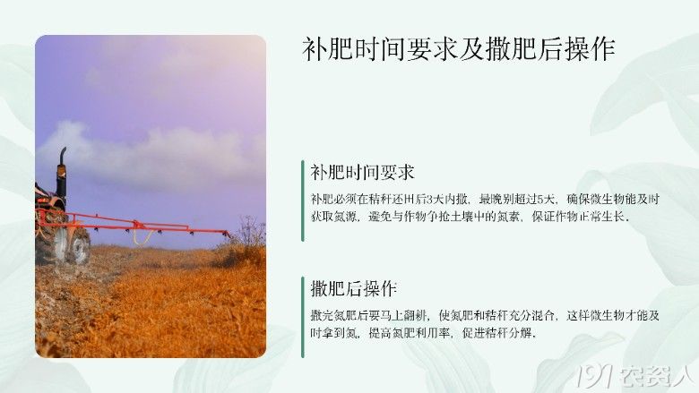 还有几个关键细节得注意。第一,别撒太晚,要是等苗黄了再补,就晚了 —— 小麦苗黄后补氮,就算恢复过来,分蘖也少 0.8 个 / 株,产量还是得降;第二,别撒太少,有的农户觉得 “撒 5 斤尿素就行”,其实不够,每亩最少 10 斤,不然微生物还是会抢土里头的氮;第三,翻耕要深,得把秸秆和氮肥一起翻到 15-20cm 深的土层,浅了(<10cm)秸秆容易露在表面,分解慢还招虫,氮肥也容易挥发,利用率降 30%。