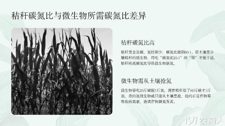 先说说为啥秸秆还田会 “抢氮”。秸秆里全是碳,氮特别少,碳氮比能到 60:1,而土壤里分解秸秆的微生物,得吃 “碳氮比 25:1” 的 “饭” 才能干活。这就好比微生物要吃 25 斤碳配 1 斤氮,现在秸秆给了 60 斤碳才 1 斤氮,差的氮微生物就只能从土壤里抢 —— 抢的不是别的,就是作物要吸收的氮素。咱测过,每亩还田 2000 斤玉米秸秆,微生物分解时会消耗土壤里 8-10 斤纯氮,相当于 20 斤尿素的氮量,土壤里氮不够,作物自然缺氮发黄。