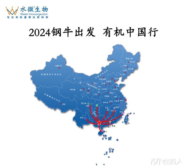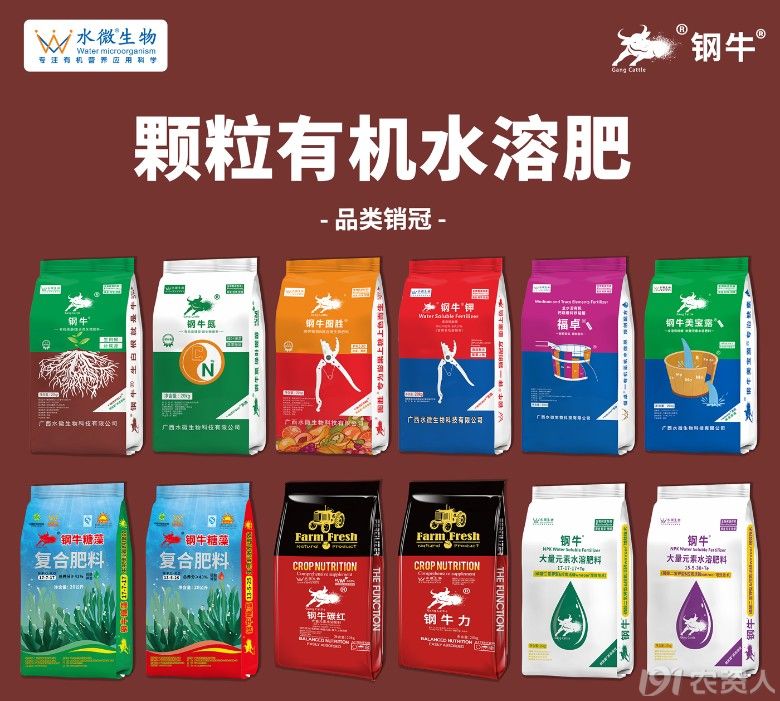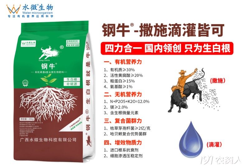 3.0版“钢牛”技术维度: 1、优化碳氮比、氮镁比; 2、加入生白根“哈贝赖复合优势菌群”; 3、进口抗生根早衰增效物; 随着钢牛品牌、供应链陆续成熟,钢牛陆续延伸出系列产品:钢牛壮、钢牛美宝露、钢牛图胜、钢牛有机无机大量元素肥料。坚持“3大保证”:保证“有机+或钢牛+”,保证够10%+复合有机物料,保证全水溶,引领有机营养肥的“有机物含量新高度”! 最后,这里特别强调:经销商朋友们,你不得关注这家新锐企业,他们正以迅猛布局“席卷南方各省打批发商”!前面提到“有机号角”就是“全溶有机无机水溶肥料”,对土壤改良、作物优生、元素吸收都是益处多多!2024,水微携钢牛北方市场见! 水微生物成立2015年,国内最早专注“有机营养”为核心方向的特肥公司,“颗粒有机水溶肥料”品类销冠,目前销量遥遥领先。水微生物公司拥有“产销一体化”体系,有自主研发生产工厂,中型特肥年销售过10000吨,产能3万吨,也有专业特肥服务团队。在合作期间,不仅帮助伙伴持续盈利同时,也坚持输出“伙伴一起成长”的赋能计划,一起成长,一起共赢。水微与有眼光的您,一起走进“有机营养肥新时代”!
