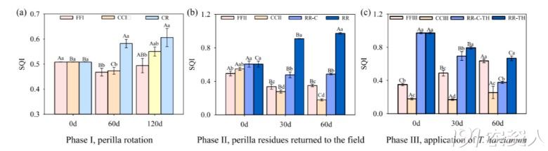 三个种植阶段土壤质量指数的变化趋势。休耕地 (FF),三七连作 (CC),轮作 (CR),残体还田对照 (RR-C),残体还田 (RR),残体还田对照后接种哈茨木霉TH7 (RR-C-TH),残体还田后接种哈茨木霉TH7 (RR-TH)。不同小写字母表示相同时间节点下不同处理间存在显著差异(P < 0.05);不同大写字母表示不同时间节点下处理间存在显著差异。(a) 阶段I中0 d、60 d和120 d时的土壤质量指数。(b) 土壤质量指数 | 图源:云南农业大学何澍然团队