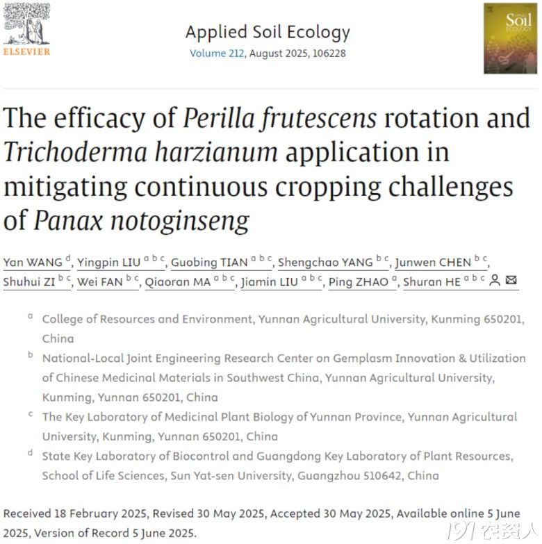 慕恩生物核心产品菌养元®(哈茨木霉TH7),在云南农业大学何澍然团队的最新研究中效果卓著。该研究发表于国际权威土壤学期刊《Applied Soil Ecology》(IF: 4.8),创新性地将紫苏轮作、残体还田与菌养元®(哈茨木霉TH7)接种相结合,三七补苗存活率较连作对照提升超过5倍。轮作与微生物菌剂的协同应用不仅能解决土壤退化困境,更能促进土壤肥力和作物抗逆性的长期提升。