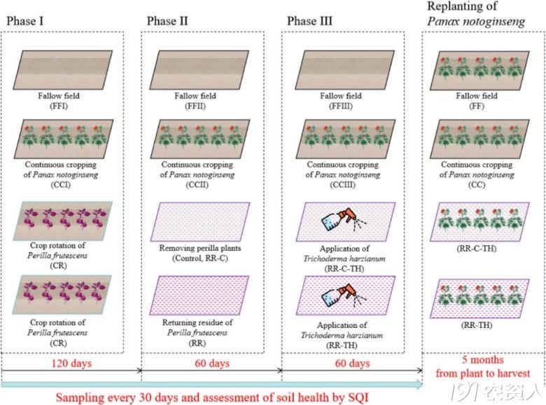 三七种植前各处理小区的实验设计与时间安排。阶段I:紫苏轮作;阶段II:紫苏残体还田;阶段III:施用哈茨木霉TH7 | 图源:云南农业大学何澍然团队最终的研究成果令人振奋,充分验证了集成方案,尤其是菌养元®的关键作用:
