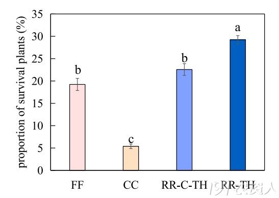 重新种植5个月后三七植株的存活百分比。休耕地 (FF),三七连作 (CC),残体还田对照后接种哈茨木霉TH7 (RR-C-TH),残体还田后接种哈茨木霉TH7 (RR-TH)。不同字母表示不同处理间存在显著差异(P < 0.05) | 图源:云南农业大学何澍然团队研究清晰表明,菌养元®(哈茨木霉TH7)在集成方案中扮演着不可或缺的“催化剂”角色:在紫苏轮作和残体还田奠定基础后,哈茨木霉TH7菌株的引入实现了效果的指数级跃升——
