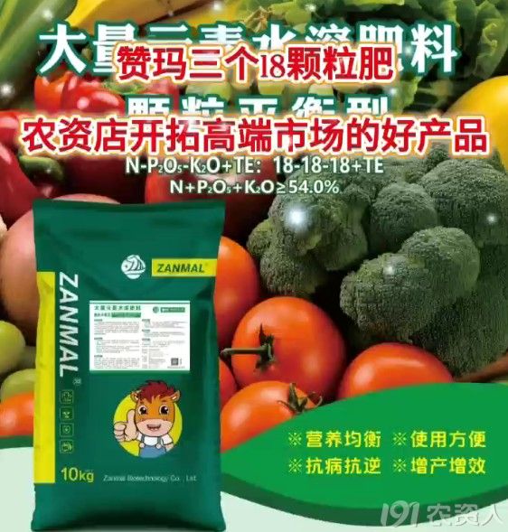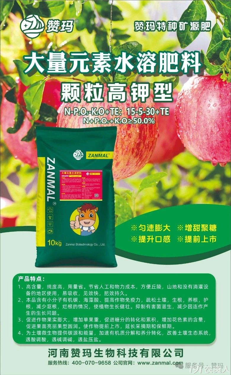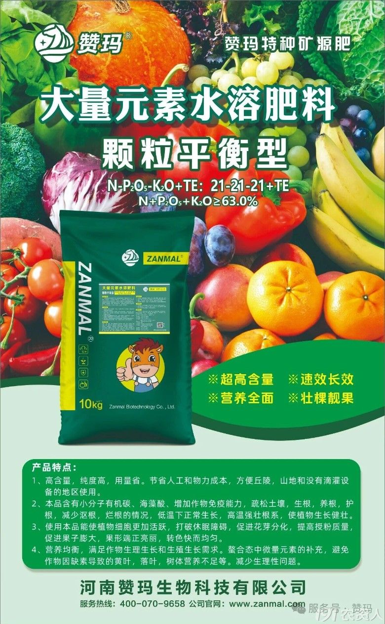 "赞玛颗粒水溶肥融合矿源、生物酶与有益菌,快速纠正缺素症状,促进作物全周期健康生长;高纯度配方疏松土壤、护根抗逆,显著提升果实品质与产量,且不伤土不板结。一肥多效,滴灌撒施皆宜,让丰收更省心。" 一、颗粒平衡型21-21-21+TE【螯合中微量元素】产品介绍:本品是赞玛公司研发生产的一款颗粒型水溶肥,采用先进工艺生产,高纯度,水溶性好,内含作物所必需的大、中、微量元素;能够为作物在整个生长周期提供均衡的营养,迅速纠正缺素症状,促进作物健康生长,显著提高作物品质,创新性地融合了矿源、生物酶、有益菌等营养成分和有机物质,实现营养、改良、增效多重作用。长期使用不会造成土壤酸化板结,不含任何激素,不伤根,易吸收,见效快,肥效持久。产品特点:1、高含量,纯度高,用量省。节省人工和物力成本,方便丘陵,山地和没有滴灌设备的地区使用。2、本品含有小分子有机碳、海藻酸、增加作物免疫能力,疏松土壤,生根,养根,护根,减少沤根,烂根的情况,低温下正常生长,高温强壮根系,使植物生长健壮。3 、使用本品能使植物细胞更加活跃,打破休眠障碍,促进花芽分化,提高授粉质量,促进果子膨大,果形端正亮丽,转色快而均匀。4、营养均衡,满足作物生理生长和生殖生长需求。螯合态中微量元素的补充,避免作物因缺素导致的黄叶,落叶,树体营养不足等。减少生理性问题使用方法:1、水溶性好,溶解速度快,易吸收。冲施,滴灌,撒施,沟施、喷施、均可。2、冲施,撒施:5-10公斤/亩,间隔10-15天一次,苗期可适当减少用量。3、滴灌:2-4公斤/亩,间隔10-15天一次,苗期可适当减少用量。4、叶面喷施:稀释800-1500倍,叶片正反面均匀喷施,苗期适当增加稀释倍数。 二、颗粒高钾型15-5-30+TE【螯合中微量元素】产品介绍:本品是由赞玛公司研发生产的高含量,高纯度颗粒型水溶肥料。内含大量元素,螯合中微量元素,稀土元素,小分子有机碳,植物酶等营养成分和优良有机质,优化土壤自身的肥力,增加土壤的透气性和保肥性,打破了常规肥料只含氮磷钾元素的单一性,和粉末大量元素水溶肥不好撒施的局限性。优质钾料补充作物生长需求,促进膨果上色,提高作物品质,使作物提前上市延长采摘期。产品特点:1、高含量,纯度高,用量省。节省人工和物力成本,方便丘陵,山地和没有滴灌设备的地区使用,易吸收,见效快,肥效持久。2、本品含有小分子有机碳、海藻酸、提高作物免疫力,疏松土壤,生根,养根,护根,减少沤根,烂根的情况,使植物生长健壮。抑制有害菌滋生减少因连作产生的生长问题,3、促进作物果实膨大,增加单果重,促进糖分的转化和累积,增加花色素的含量,促进果面亮丽,果型圆润。使作物提前上市,延长采摘期和保鲜期。4、为土壤微生物提供碳源和能量,加速有机质分解和养分转化,改善土壤生态系统,遇酸调酸,遇碱调碱,遇盐压盐。使用方法:1、水溶性好,溶解速度快,易吸收。冲施、滴灌、撒施、沟施、喷施、均可。2、冲施,撒施:5-10公斤/亩,间隔10-15天一次,苗期可适当减少用量。3、滴灌:2-4公斤/亩,间隔10-15天一次,苗期可适当减少用量。4、叶面喷施:稀释800-1500倍,叶片正反面均匀喷施,苗期适当增加稀释倍数。 三、颗粒平衡型18-18-18+TE【螯合中微量元素】产品介绍:本品是赞玛公司研发生产的颗粒型水溶肥,高塔全水溶工艺,溶解快,易吸收。大量元素氮,磷,钾,整合态中微量元素含量均衡。避免单一养分缺少导致的生长不良。适合多种作物,从生根,长叶,开花,结果等全生长周期使用,能快速满足作物对养分的需求。确保作物生长所需的养分供应;特别添加的矿源,生物酶,有益菌能缓冲土壤PH值,缓解板结盐碱,调理补充相结合让作物根系强壮,叶片厚绿,茎秆粗壮,花多,花大,果实饱满,甜度提升提高作物品质和产量。产品特点:1、本品含有小分子有机碳、海藻酸、增加作物免疫能力,疏松土壤,生根养根,护根,减少沤根,烂根的情况,低温下正常生长,高温强壮根系使植物生长健壮。2、使用本品能提升作物细胞活跃度,和光合速率,促进花芽分化,提高授粉质量,促进果子膨大,果形端正亮丽,转色快且均匀。3、营养均衡,满足作物生理生长和生殖生长需求。避免作物因缺素导致的营养不良,生长缓慢,根系早衰等问题。使用方法:1、可采用淋施、冲施、撒施、沟施、穴施等方式,适用于多数大田和经济作物。2、冲施,撒施:10-20公斤/亩,根据作物长势适当调整使用量。3、滴灌:5-10公斤/亩,根据作物长势适当调整使用量。4、叶面喷施:稀释800-1500倍,叶片正反面均匀喷施,苗期适当增加稀释倍数。颗粒水溶肥系列从抗逆护苗到品质升级,赞玛用科技工艺将 “高产密码” 凝缩成每一粒颗粒。这个丰收季,让赞玛与你同行,以更省心的施肥方式、更显著的种植效果,解锁土地的无限潜能!
