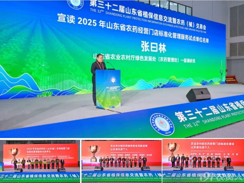 随后大会还举行了隆重的授牌与表彰仪式。山东省农业农村厅绿色发展处(农药管理处)一级调研员张曰林,宣读了“2025年山东省农药经营门店标准化管理服务试点单位名单”;全国农技推广服务中心研究员束放,宣读了“农业农村部农药使用安全风险监测”山东省先进个人名单;山东省农药检定所所长张耀中,宣读了“农业农村部农药经营门店标准化建设”山东省先进个人名单。