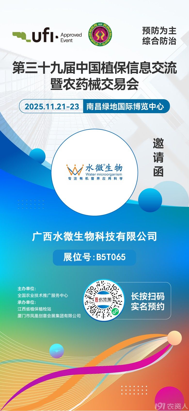 一年一度的全国植保会如约而至,2025年11月21日-23日,第39届全国植保会在英雄城-江西南昌举办。本次植保会是一次农资人相聚的盛会,爆品汇聚相约英雄城。水微生物凭借多年行业沉淀和学习,应邀参加本次会议,高效推广“有机糖碳营养肥”。
