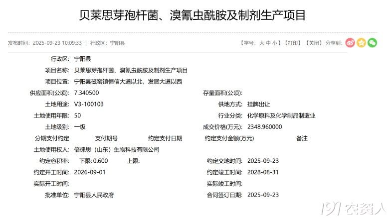 2025年1月,倍徕思(山东)生物科技有限公司贝莱斯芽孢杆菌、溴氰虫酰胺及制剂生产项目(一期)在相关网站环评受理公示。